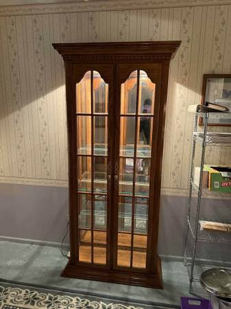 Large Lighted Curio Cabinet & Solid Oak Bistro Table with 2 upholstered chairs