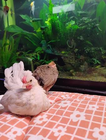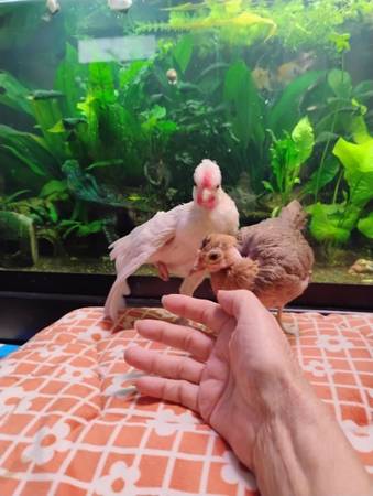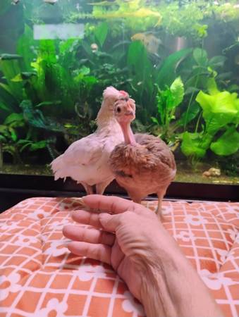 Breeding pair of Puerto Rico Kikiriki chickens. Naked Neck Hen Toppy Roo 7wks old. Ready to roam to new coop. House raised, handled everyday. Very, very friendly. Micro breed, super tiny. Added...