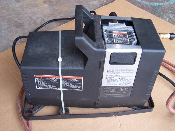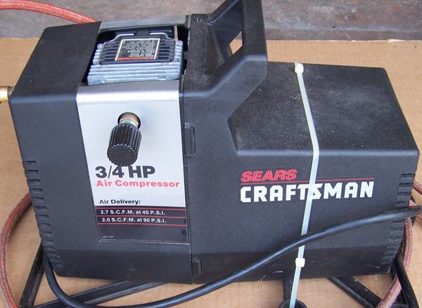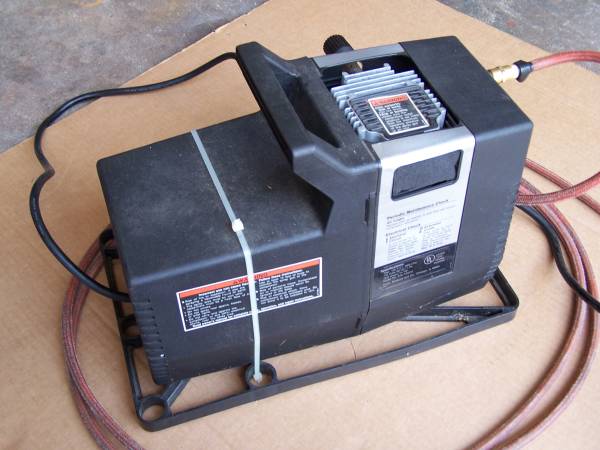 Please view all photos that shows exactly the type of air compressor for sale. Has a 18ft 3/8" air hose with tire air chuck. Works good. Lightweight and easy to store on a shelf or cabinet. Was used for putting air in the kids bike tires/and family car tires. Direct air. $35.00 ONLY PHONE CALLS/VOICEMAIL TAKEN. No emails or texting, I am very old school. Thanks for understanding.. Calls taken from 8am to 9pm..Still being used until it sells..