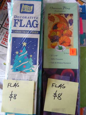 Holiday Banner Flags --New in Package-Half Price-- All are 100% polyester, fade and mildew resistant: 2 - Thanksgiving Cornucopia 27" x 40" Christmas Tree 28" x 40" SOLD OUT 1 - Summer "This is my...