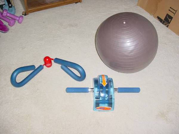 For sale are a Thighmaster, an Ab Roller and a 28"x 58" padded exercise mat. $25 for all as a package only. I will also include for free an exercise ball.