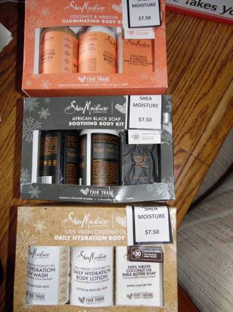 Shea Moisture Soap and Lotion Body Kits --Half Price-- These sets contain: - 1 Body Lotion - 1 Body Wash - 1 Bath Bar Soap - 1 Bath Sponge And they come in 3 different varieties: - Coconut and...