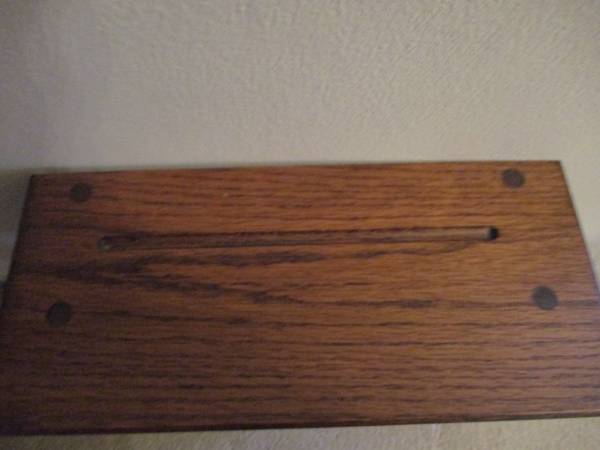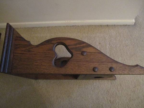 Solid oak, handcrafted wall-mount shelf with pegs & heart cut-outs on back & sides. Slotted on top to safely display a plate, slotted out on back for ease in hanging on wall. 15 ½” T x 12” W...
