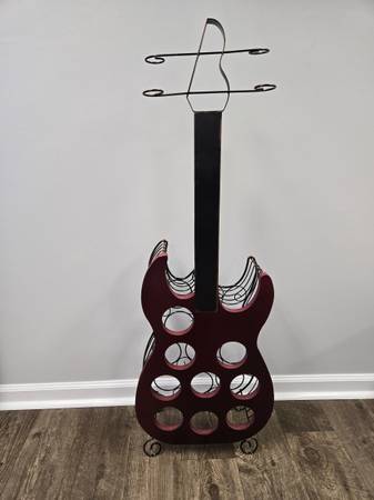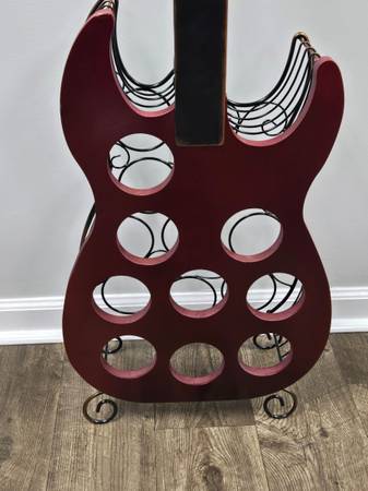Vintage Wood and Metal Guitar Shaped 9 Bottle Freestanding Decorative Wine Holder. Also holds 4 wine glasses. Sells for $177 New out of box $100