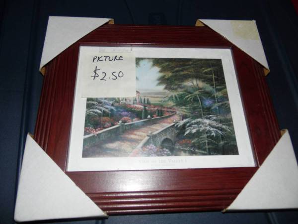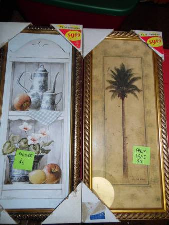 Pictures in Frames 8" X 16"--New in Package-Half Price-- These are ready to hang! I have 3 left: Palm Tree $5 (tall and thin) Kitchen items $5 (tall and thin) Beautiful country side $2.50...