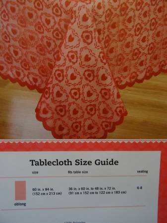 Red Lace Heart Table Cloth 60''X84''--New in Package-Half Price-- These Red Lace table cloths have heart shaped laces and measure 60'' X 84''. Only 6 left - $8 each. Warren Residence near 10 Mile...