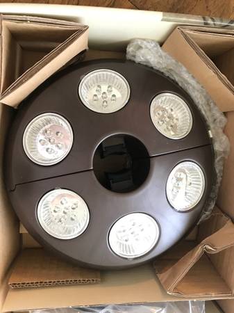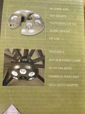 Treasure Garden battery rechargeable LED umbrella light. Like new. Vega-L-00 Bronze. 6 lights. Fits around umbrella pole to add mood to outdoor table area. Easy-to-use clamp-on feature that self adjusts to fit patio umbrella poles from 1 3/8” to 2” diameter. Can use in downlight or uplight position. Like new condition. Cash and carry.