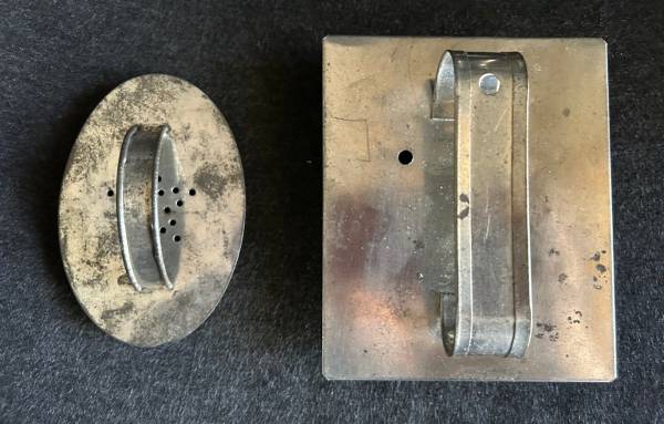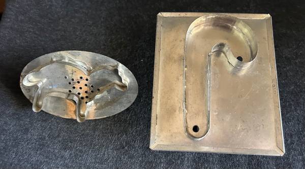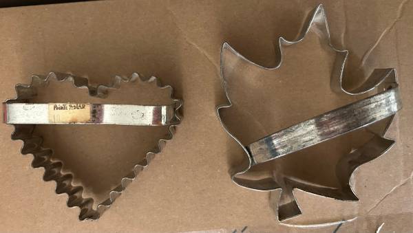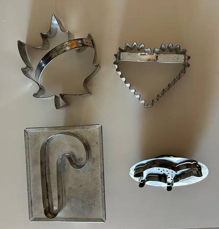 Lot of 4 - Vintage Flat Back With Handles, Primitive Cookie Cutters (Candy Cane & Dog/Wolf) and Vintage Large Maple Leaf Cookie Cutter / Fall Cookie Cutter and Antique Tin 4" Ruffled Heart...