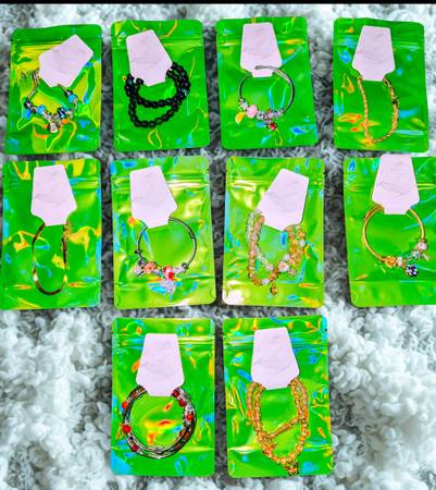 Mystery jewelry pouches, all brand new items, you can choose from 10 necklaces, 10 bracelets or 5 of each! Order online! www.adorbmystery.com