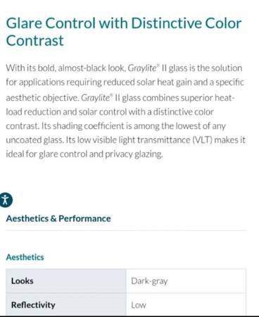 Glare Control with Distinctive Color Contrast with its Bold, Almost‑Black Look, Graylite II Glass is the Solution for Applications Requiring Reduced Solar Heat Gain and a Specific Aesthetic Objective. Graylite II Glass Combines Superior Heat-Load Reduction and Solar Control with a Distinctive Color Contrast. Its Shading Coefficient is Among the Lowest of Any Uncoated Glass. Its Low Visible Light Transmittance (VLT) Makes it Ideal for Glare Control and Privacy Glazing.