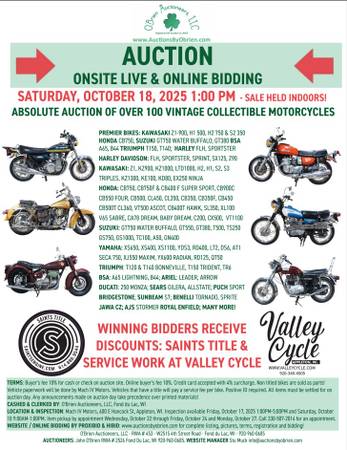 Saturday, October 18 at 1:00PM Central in Appleton, WI Absolute auction of over 135 vintage motorcycles