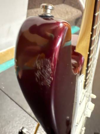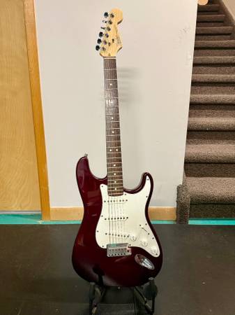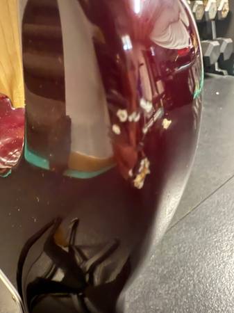 Candy Apple Red with rosewood fingerboard. Original hard case. As beautiful as you'd expect for an American Strat. Some chips and scratches on horns only.