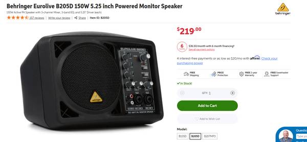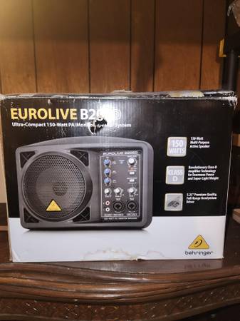 From Behringer: The Behringer Eurolive B205D portable PA speaker is ideal as a stage monitor for vocalists and keyboardists thanks to its mic stand mountable design. It's also a great speaker for small-scale public address - just plug a microphone directly into the B205D and you're ready to be heard. The 3-channel mixer gives you mic and line inputs, including RCAs for music players. And the 3-band EQ lets you fine-tune your sound easily. Whether you're looking for a convenient stage monitor or a portable PA system, the Behringer B205D is a solid choice.