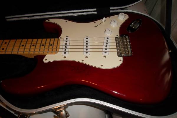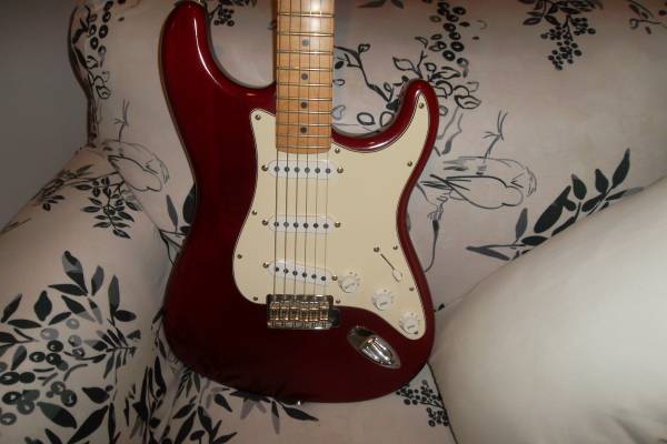 2002 USA Fender Highway One Stratocaster, 1st year issue. Satin Red, ( burgandy or maroon) Pror owner buffed paint to more of a shine. Excellent Cond, All Orig. Comes with Orig. Fender HSC. $1200.,...