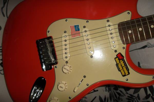 2006-07 Very Rare Fender Special Run 60th Anniv. Edition Stratocaster. American Series Midwestern Region, Fiesta Red, with same color Headstock, and 1 of 100 in Fiesta Red. Mod 017-0063-740. Texas Special Staggered Pick ups.This guitar is in New Cond. with plastic protective covering on pickguard and Back plate. All hag tags and tremlo bar, and comes with Orig Fender Tweed HSC, $2200.00, No Trades