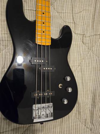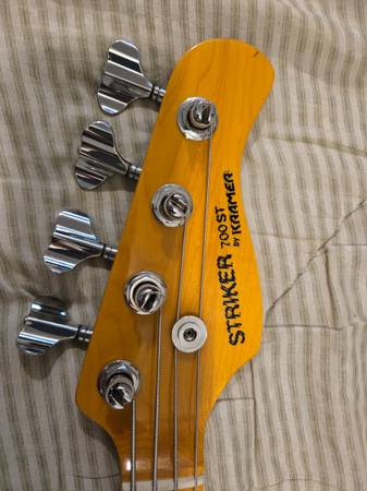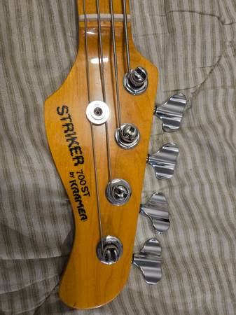 1980s kramer made in korea striker 700st 4 string bass guitar the color is black with a 21 frets and a nice maple neck with chrome hard whare and 4 grover tunning pegs with p and a jazz pick ups with a 3 way toggle switch and 3 control knobs it plays and sounds good and is in like new condition the price is $375.00. Or best offers