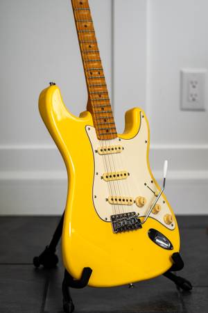 For sale is a 1996 Fender Yngwie Malmsteen Signature Stratocaster in Yellow/White with DiMarzio pickups. This MIJ (Made in Japan) model is highly collectible and features the scalloped maple fingerboard, vintage-style tremolo, and lightning-fast neck that Malmsteen fans love. The guitar is in excellent condition and plays beautifully, delivering that classic neo-classical Strat tone with precision and clarity.