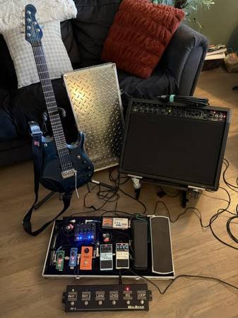 For the amplification, this package is including a Mesa Boogie Mark IV Combo Widebody. This thing is an absolute powerhouse. I am not even exaggerating. These amps are designed to be some of the best that people can invest their hard-earned money into because they are versatile, strong, dependable, and loud. Really loud. This amp has a rear-mounted Celestion Custom 90 watt Black Shadow speaker that has never given me anything but steadfast sound. This amp has a remote, rear-mounting foot switchboard that gives the player the option of 3 different main modes of sound which I’ve always used to offer those different sounds of Clean (Rhythm 1), Dirty (Rhythm 2), and a driving Lead channel that comes with the presence common with the Mesa company. Each of these channels have their own respective turn dial 3-band EQs, each with additional flavors of sound (Bright for Rhy1, Fat for both Rhy1 & Rhy2) and each channel offers Presence controls. Overall, these channels have an additional 5-band EQ that can be switched on and off via the remote foot switchboard that offers a way to give the player additional methods of changing and shaping the sound to fit their needs. This amp also has the ability to Slave out for using just the Head in cases that you want to run the sound through larger speaker cabs or directly into the mixing board for recording purposes. The amp is loaded with SPAX7 preamp tubes and a brand new set of 4 STR 445 Power Tubes that I have not taken out of the box yet to guarantee freshness. This amp has so much more to it that I do not have the space to include here which makes it so thoroughly valuable. I replaced the caster wheels a few years ago and added 2 with brakes to help as an option. This amp will also have an angled amp stand that I used to help hear the sound more directly while performing on stage and came in so useful to really dial in the sounds I needed. This stand folds flat for easier transport/storage and has small locks on it to keep it held in place to prevent damage.