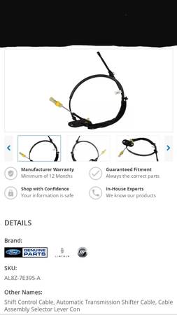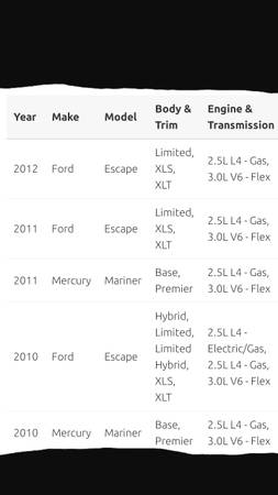 Brand new Ford OEM Selector Lever Cable Assembly. Ford part# AL8Z-7E395-A. Fits 2010-2012 Ford Escape & 2010-2011 Mercury Mariner. Please refer to chart for proper vehicle fitment. Asking $15.00. Pickup 14 mile and Harper area. Texts and emails only please.