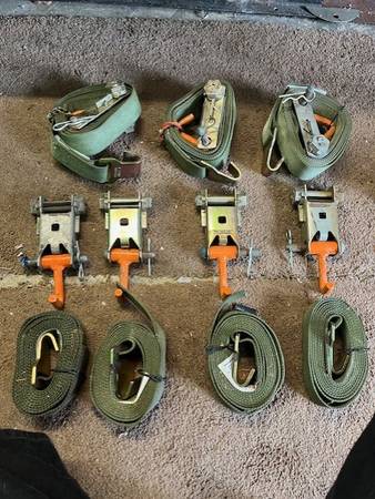 For Sale 7 9' Tie Down Straps with Pined or Hooked Rachet end, Rated At 1,670 lbs Wrench is required to operate Secure you Rachets right to the trailer $10 per rachet setup or $50 for all As is...