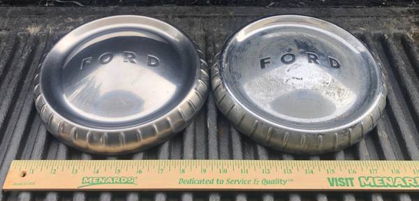 Add an authentic, period-correct touch to your classic Ford with this genuine pair of vintage "dog dish" (poverty cap) hubcaps.