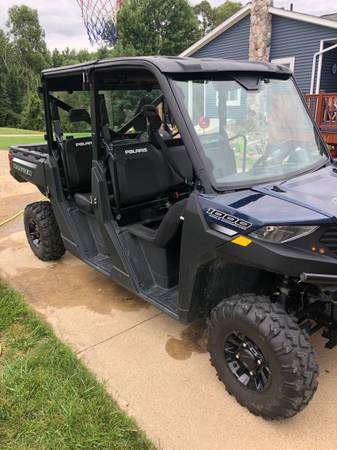 2021 Polaris ranger crew 1000 premium glass windows front and rear hard roof Polaris canvas doors locking 4500#winch Rino heater directionals front rear bumpers KFI pro poly 72 in plow never used mirrors manual wiper 5100 miles 496 hrs runs and looks like new