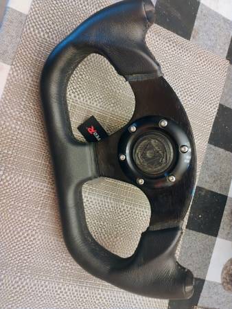 1/2 round steering wheel (leather) like new, comes with mounting adapter, cool for go cart, golf cart etc.