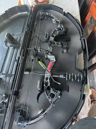 Pse vision compound bow complete ready to hunt package. Tru glow 5 pin sight, whisker biscuit arrow arrest, new archery products, carbon stabilizer, tru nok D Loop. Six carbon express maximum red...