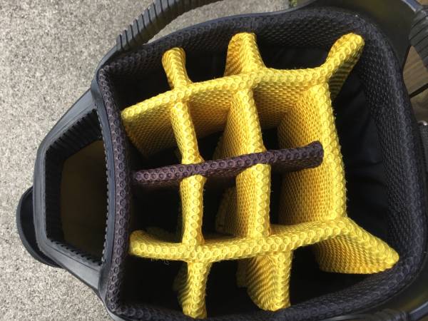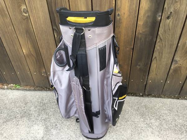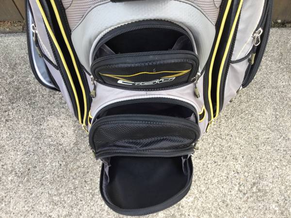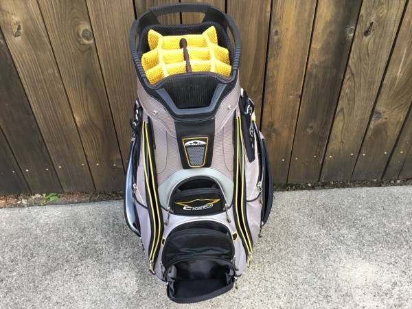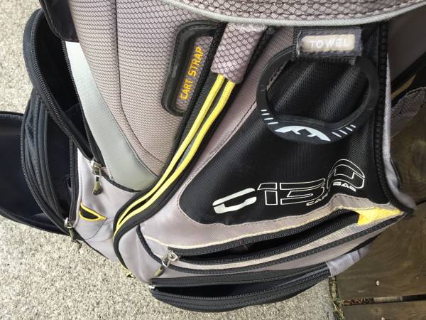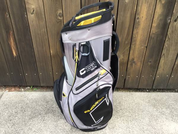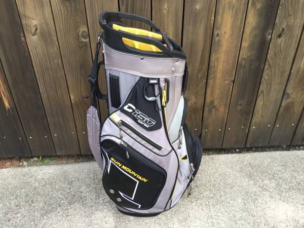 Sun Mountain “130” Cart Bag, Hardly used, 14 Holes, plus spot for umbrella, carry strap, cooler bad in 1 of side pockets,- with 2 little vent holes. No Rain Cover ( but it doesn’t rain much in Michigan). This is a really nice bag, hardly used, well taken care of, as shown in pictures, top to bottom. This bag has 9 pockets to put all of your equipment in! DONT Miss Out on this great bag !