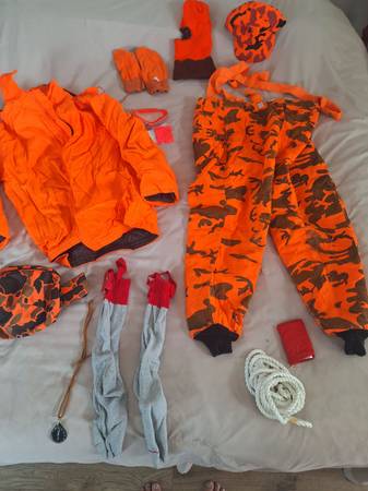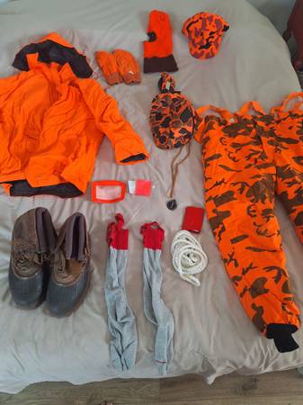 Used 2 seasons in excellent condition. Coat is size L but very loose could fit XL. Bibs fit up to 36 38. Boots are like new Lacrosse size 11 cost $130 alone. lots of accessories included.