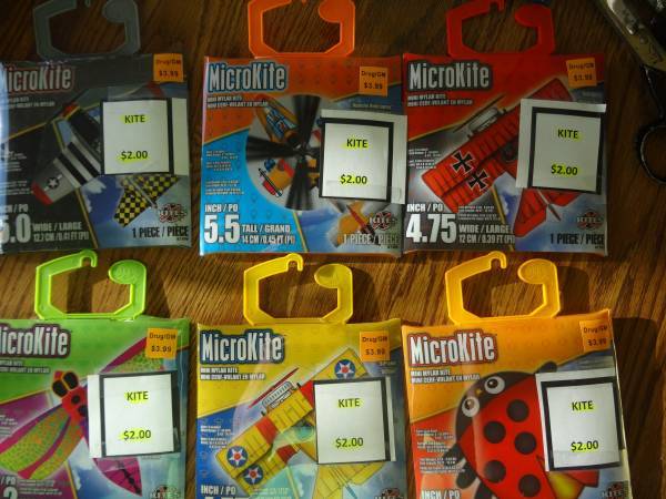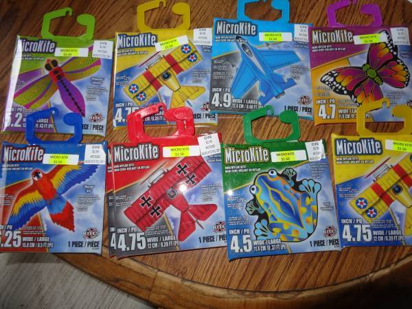 Micro Kites --New in Package - Half Price-- Many varieties: $2 each Dragon Fly - 2 available Bi-plane - red - 2 available Bi-plane - yellow - SOLD OUT Jet - SOLD OUT Butterfly - SOLD OUT Parrot -...
