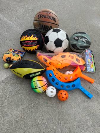 LARGE QTY. OF TOY BALLS, TOYS. SOME NEW. (1) PAIR OF KIDS SWIM FINS. ALSO INCLUDED FOR FREE ARE: (1) KIDS INFLATABLE POOL RING AND (2) INFLATABLE RAFTS. SEE PICS..... $15.00.....THANX.....MIKE..... .