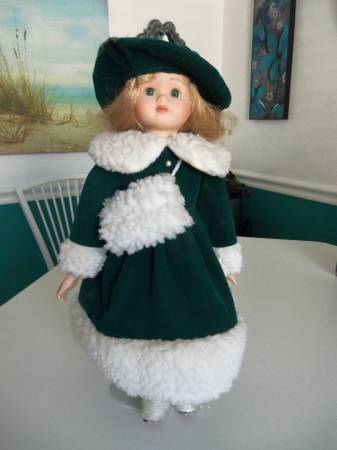 Selling a victorian style doll. Green coat with white bag. 16 inches. Comes with a stand. Was grandmothers. Do not know the brand.