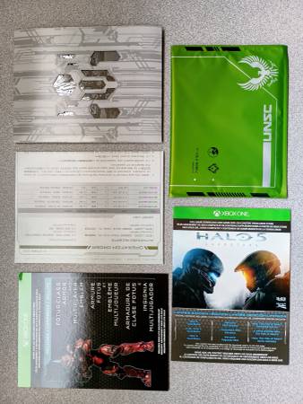 Halo V Steelbook that came with the Halo Xbox one console I bought years ago. It is untouched and complete with the unopened items, steel model kit, maps and everything else except for the download...