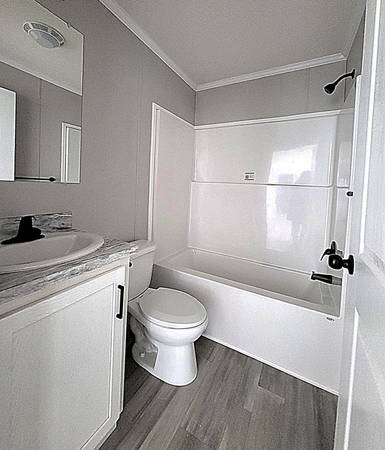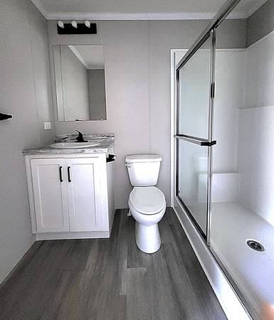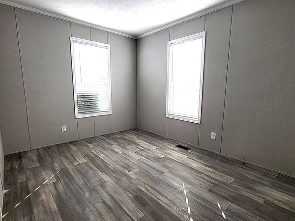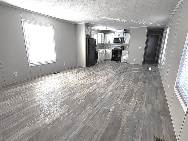 You will appreciate the spacious, open floor plan, beautiful gray flooring throughout, and stunning farmhouse kitchen. Primary bedroom is an ensuite with walk-in shower. The second bath and bedroom are located next to the living space. Laundry area is next to the kitchen. You will enjoy the lovely back yard! There will be a shed for storage. This home will not last long.