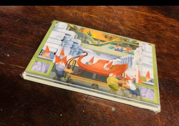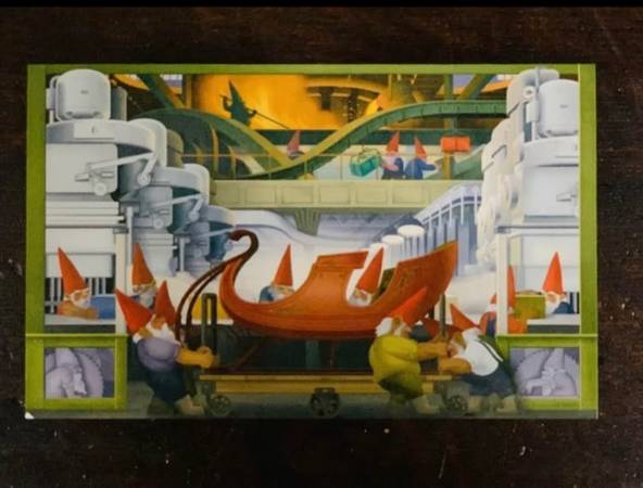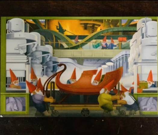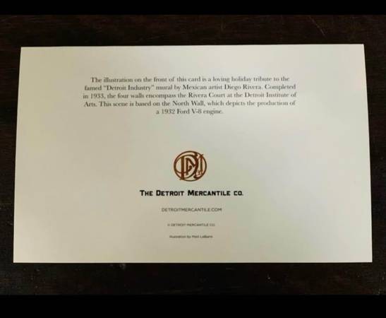 A loving holiday tribute to the iconic Detroit industry frescoes by the famed Mexican artist/muralist/activist Diego Rivera. Completed in 1933, the four wall panels comprise the Rivera Court at the Detroit Institute of Arts. This scene is based on the north wall panel and depicts the production of a 1932 "Flathead" Ford V-8 engine.
