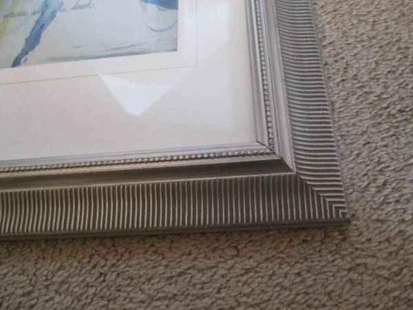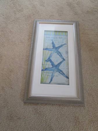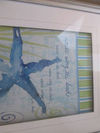 Beautiful tropical themed wall art featuring couple star fish and words "walk along the beach". Light blue and green background color provides a feel of cool freeze in warm climate. Stylish frame. Closest next thing to be at the beach! Ideal for sun room, living room, family room. Mint condition. From non-smoking home. Measured 15" (width) x 27" (height).