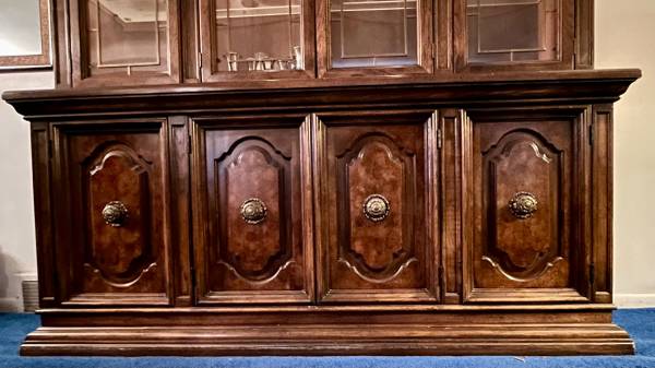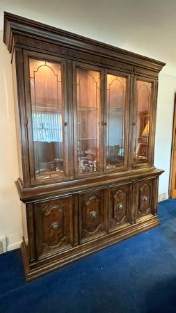This is almost like new condition extremely well cared for solid wood mahogany China cabinet / hutch buffet with lights never moved since originally bought many years ago. We also have a matching dining room table with two leaves and dining room chairs. Other vintage antique furniture you may inquire.