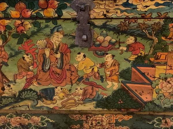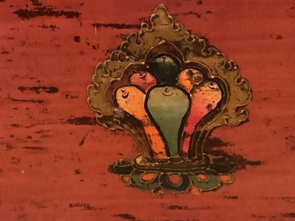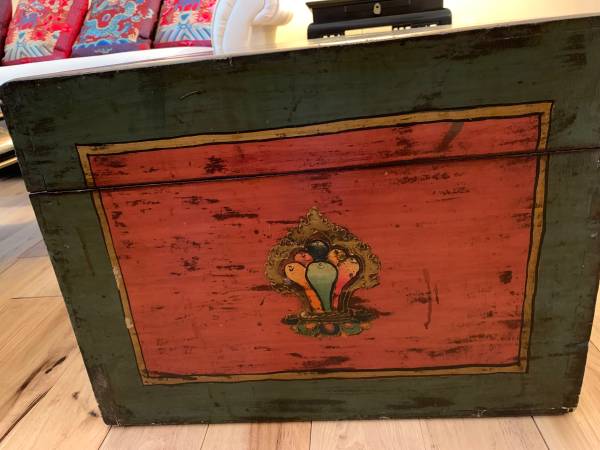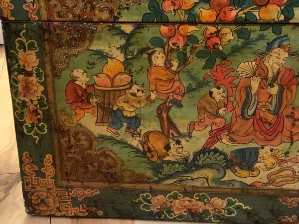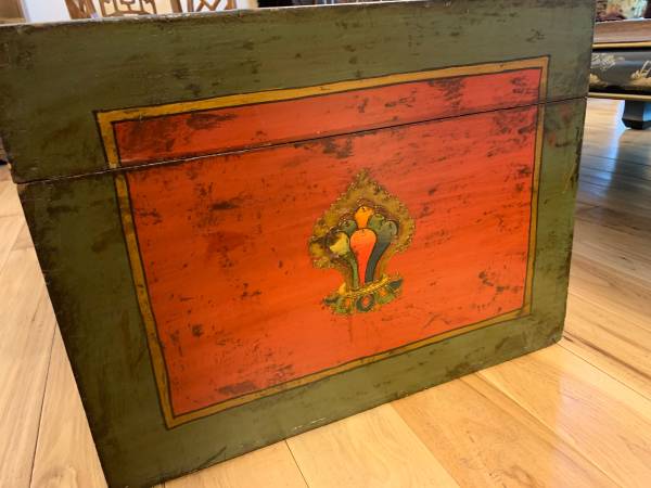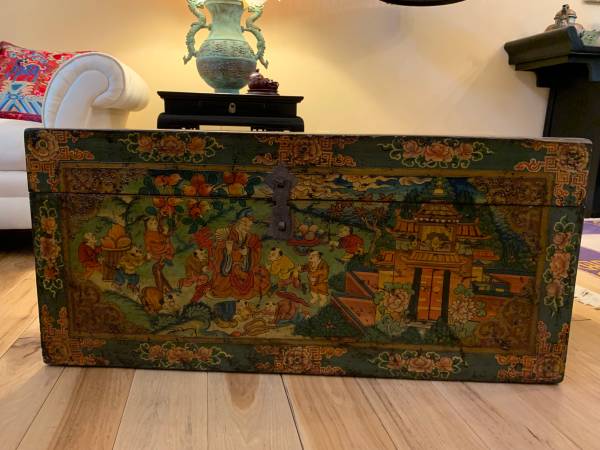 Explore the essence of Tibetan artistry with this antique painted trunk linen chest, a testament to traditional craftsmanship. Its unique design showcases the intricate work that went into creating a piece that stands the test of time, both figuratively and literally.
