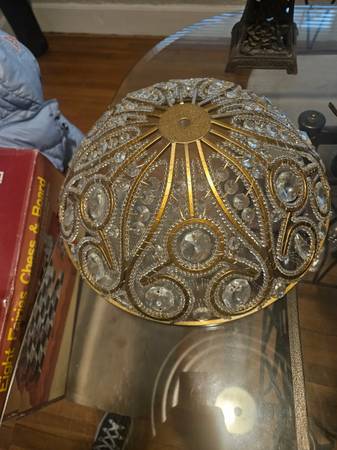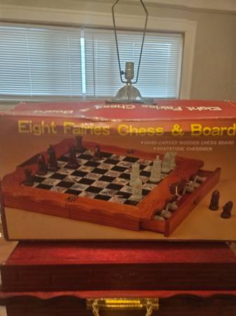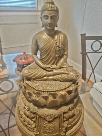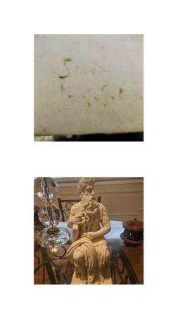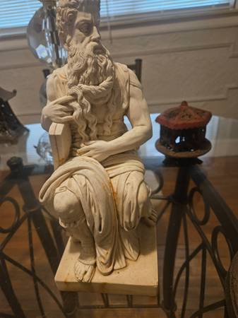 One laterm $30 One crystal light cover $75, Vintage LG 70's table lamp all glass needs shade and repair wire $150, Vintage Brass Goddess $150, Vintage signed Moses sculpture $200, Soap stone carved pieces wooden chess set $200 retail $1,000
