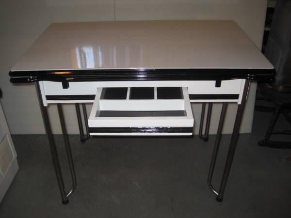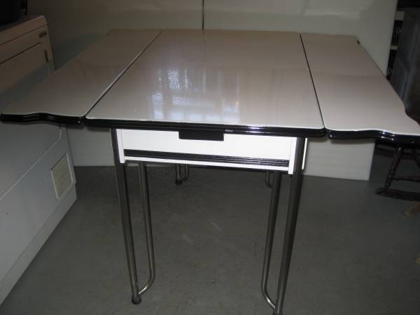 1. Antique porcelain top farm table with silverware drawer, pull out leaves, hairpin legs, measures 31 1/2" H x 40"W x 25"D 45" with leaves out, nicely refinished condition. $125.00