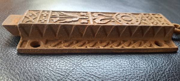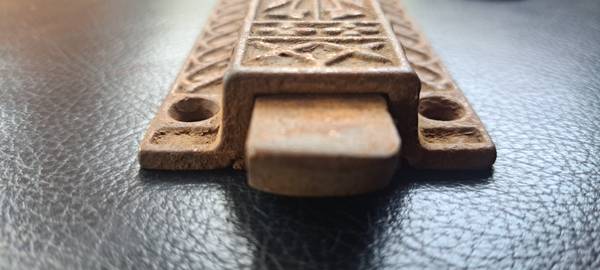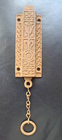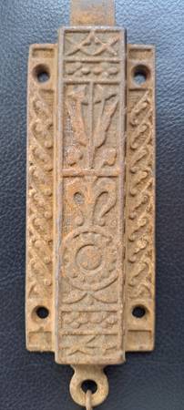 Door bolt for French door or cabinet. Includes short chain and pull ring. This type of hardware is characteristic of the Eastlake style, a popular design movement during the Victorian era,...