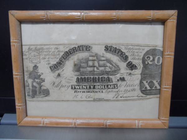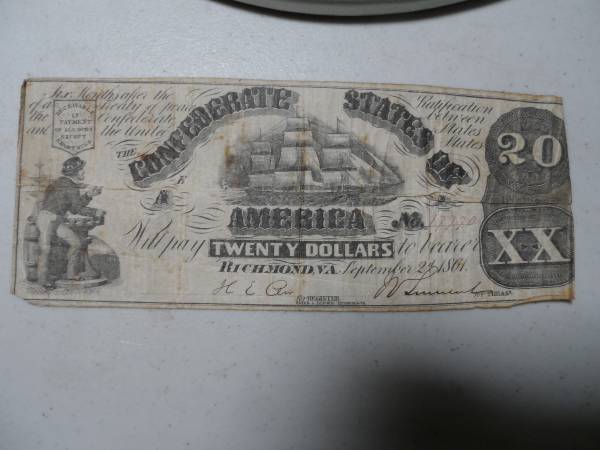 1861 CONFEDERATE $20 BILL RICHMOND, VA. SAILING SHIPS