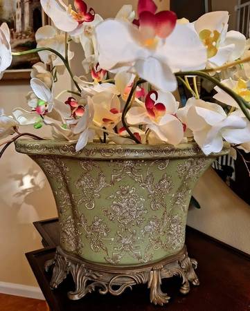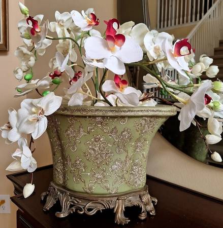 Floral Large Jardinière Centerpiece Vase Crazed Glazed Porcelain Detailed Brass Base