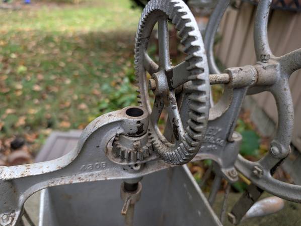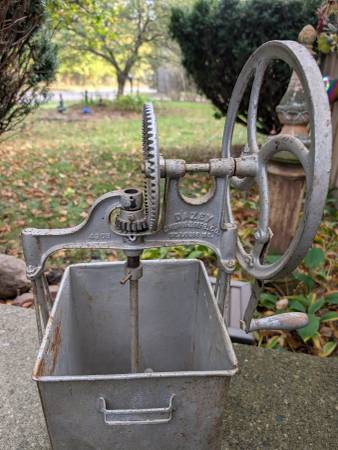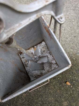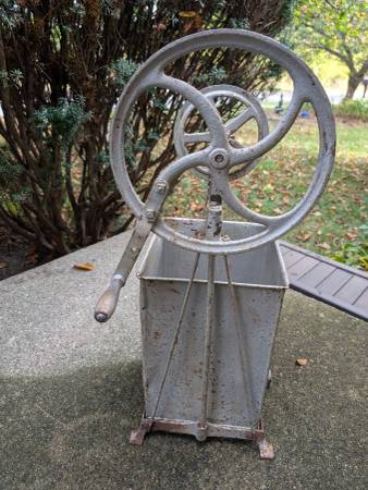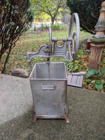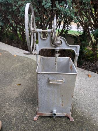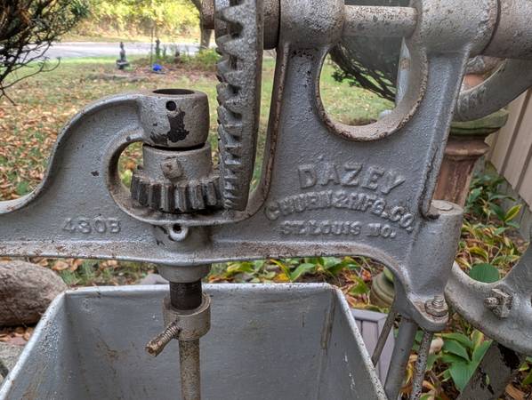 Antique primitive Dazey 3 gallon metal butter churn, model 330B, patented December 18, 1917. This is a great piece of history. It has a blue rectangular metal tub, with handles and a wonderful primitive surface; a wooden lid divided into two parts, each with a small round knob; and it sits in a cast iron footed stand, with the turning mechanism on top. The 10 inch turning wheel has a wooden handle. It is in good primitive condition, sturdy and very functional; the turning mechanism works great. Please refer to the 4 photographs for appearance and condition. This would be a great primitive display piece or could be used to make a large amount of butter. The top is missing, but it is originally just 2 boards, and can easily be remade.
