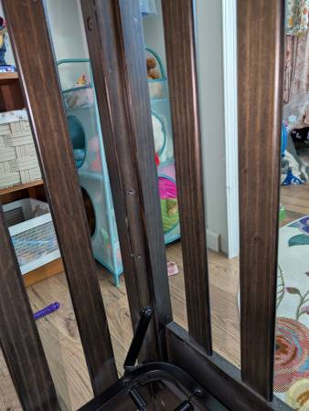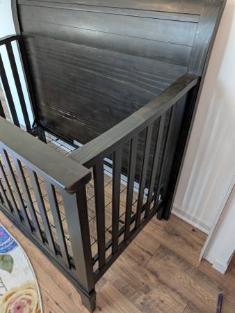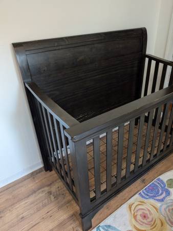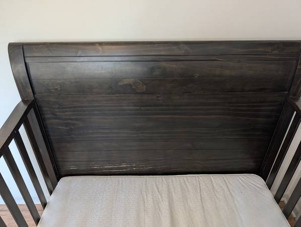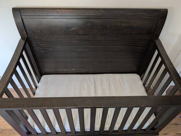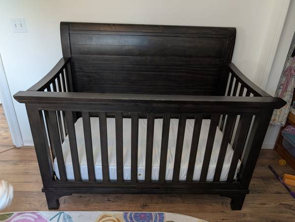 This is a solid wood convertible crib in a rich dark espresso finish. It’s sturdy, high-quality, and has a timeless sleigh-style design that fits beautifully in any nursery.