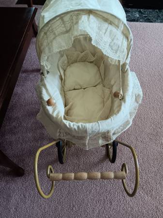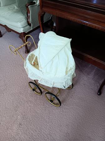 Vintage Doll Bram Stroller Buggy Woven Basket Metal Framing Wood and Metal Handle Rubber and Metal Wheels Fabric and Lace Insert and Bonnet Bonnet folds down; one of its ties is missing Two stuffed...