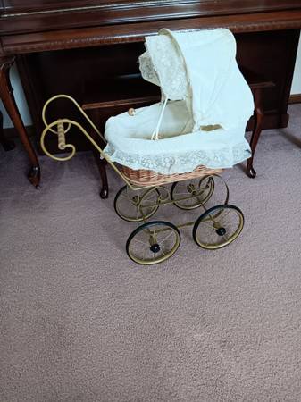 Vintage Doll Bram Stroller Buggy Woven Basket Metal Frame Used -...
