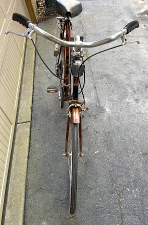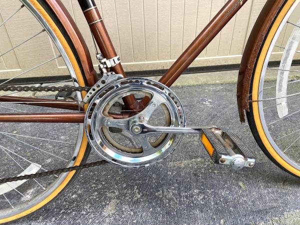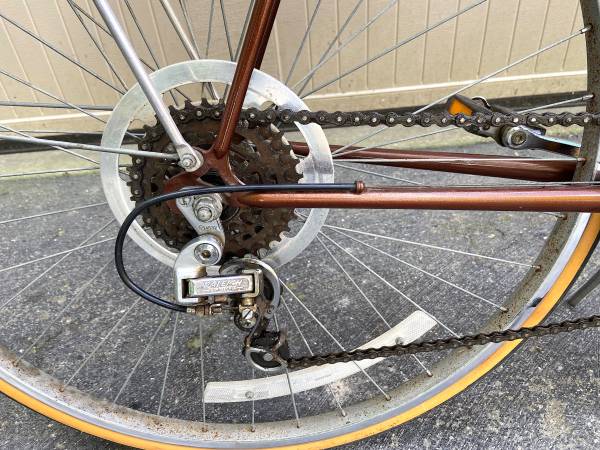 This is a 10-speed Raleigh touring bike with a lug-brazed 26" steel frame for durability. It has a Brooks saddle with loops for a saddle bag, Suntour derailleur system, and Weinmann caliper action brakes. A very nice feature is the Swiss-made Pletscher pannier shelf with spring-loaded clamp for carrying items safely. The kick stand is by Pletscher also.