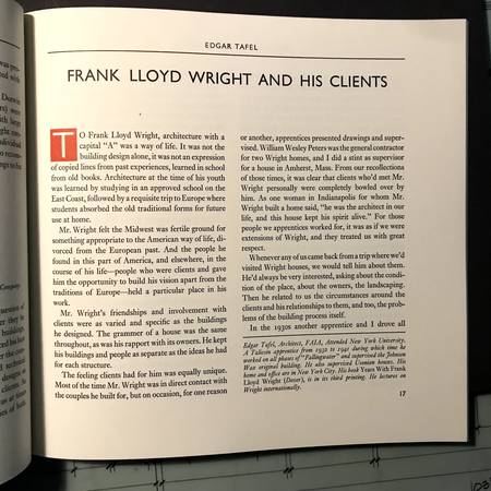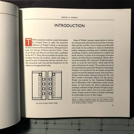 Description: This premier issue was published on the occasion of "The Wright People," a symposium and festival celebrating the clients of Frank Lloyd Wright and the manufacturers of his designs. 1) Forward 2) Introduction 3) Frank Lloyd Wright and his Clients 4) The Role of the Client 5) The Early Years: Twenty Years After 6) The Alpaugh House in Northport 7) How Fallingwater Began 8) The Lovness Residence 9) The Wright Choice 10-15) Manufacturers: Steelcase; Schumacher; Atelier; Heinz; Partial checklist; Information on the Color Plates. Includes 33 illustrations.